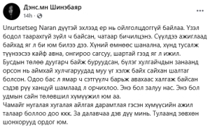 Сэтгүүлч Т.Шинэбаяр: “Unurtsetseg Naran дүүтэй эхлээд ер нь ойлголцдоггүй байлаа. Үзэл бодол таарахгүй зүйл ч байсан, чатаар бичилцэнэ. Сүүлдээ ажиглаад байхад яг л би юм билээ дээ. Хүний өмнөөс шанална, хүнд тусалж түүнээсээ кайф авна, онгироо сагсуу, шартай гээд яг л ижил.